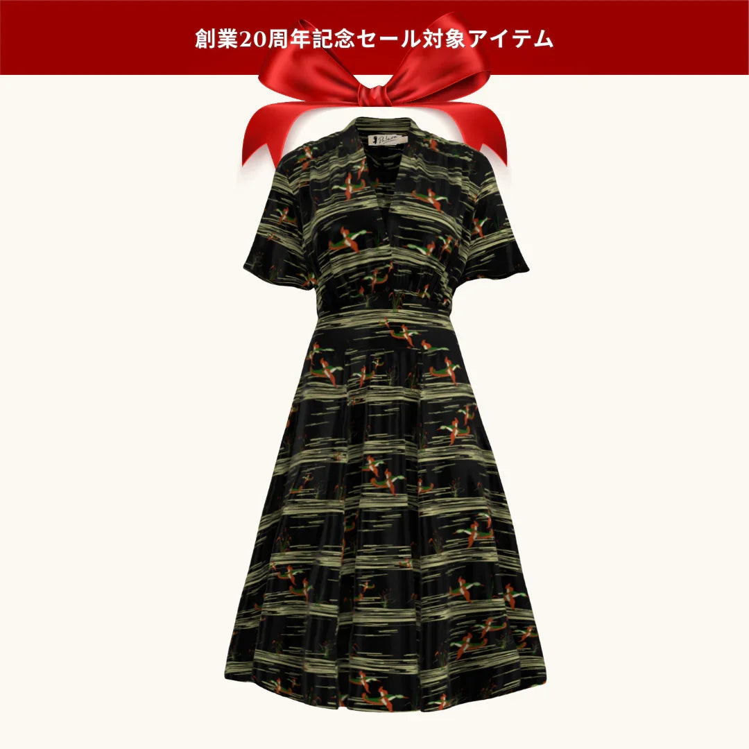 パラバでは珍しいブラックのバックグラウンドに、水面から飛び立つ鮮やかなカモ。実は1940年代のヴィンテージデザインにインスパイアされたもの。リタドレスのシルエットともバランスの良いイラストレーションで、エレガントなドレスに仕上がっています。