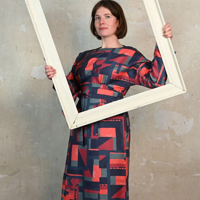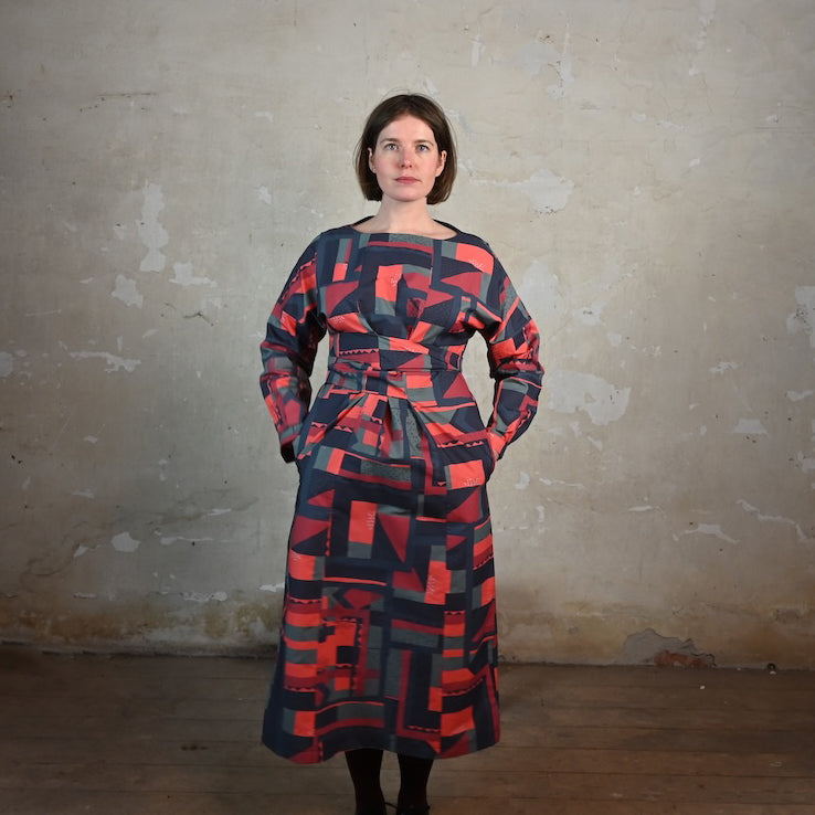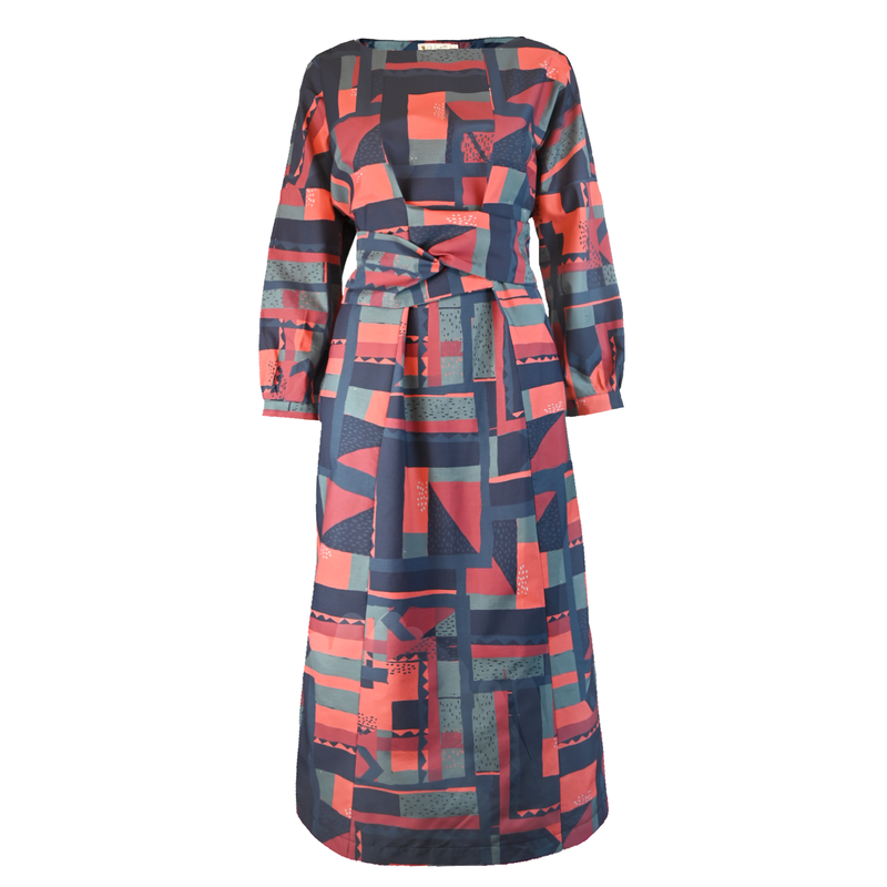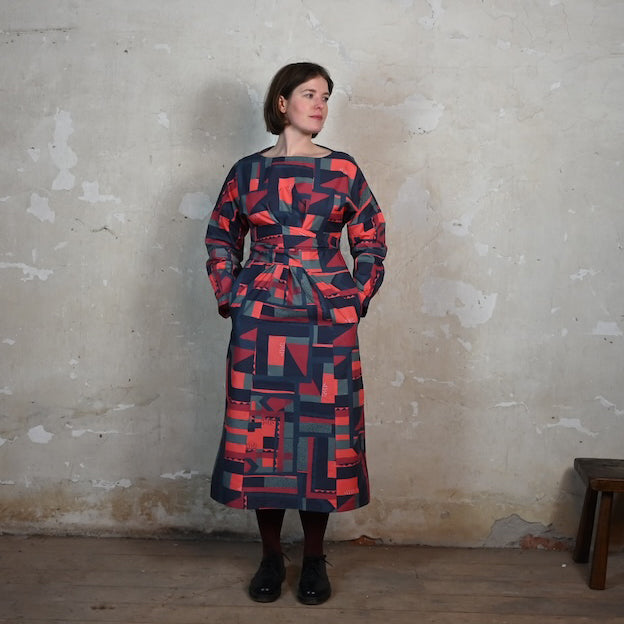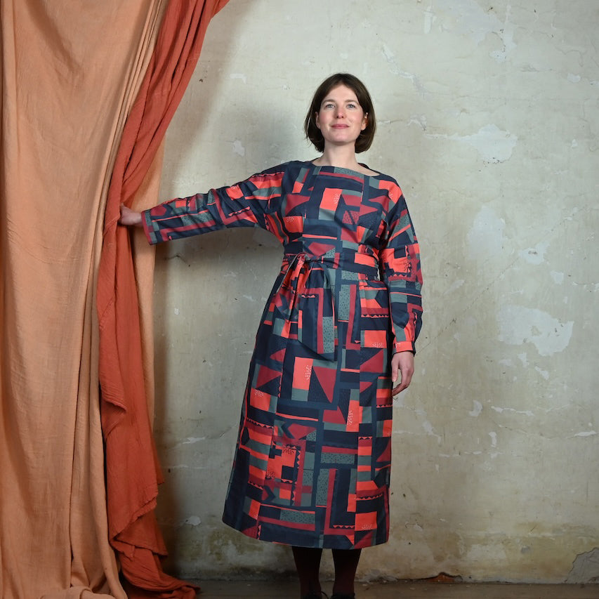 自然の光景と共にブライオニーの定番でもあるアブストラクト(幾何学模様)プリントと、鮮やかな原画に絶妙な霧がかかったようなネイビー、コーラル、シーグリーンの色合わせも素敵。