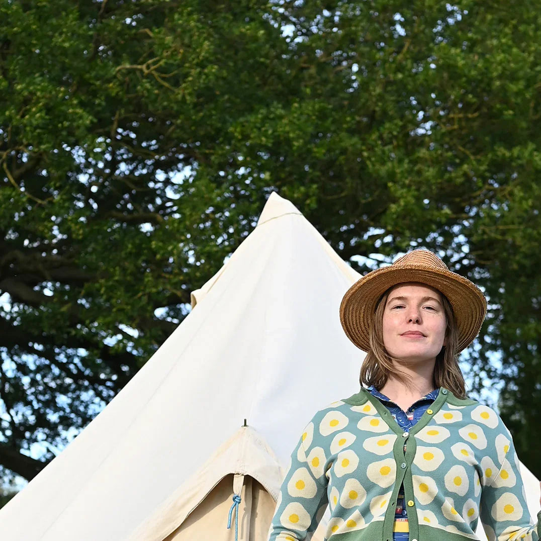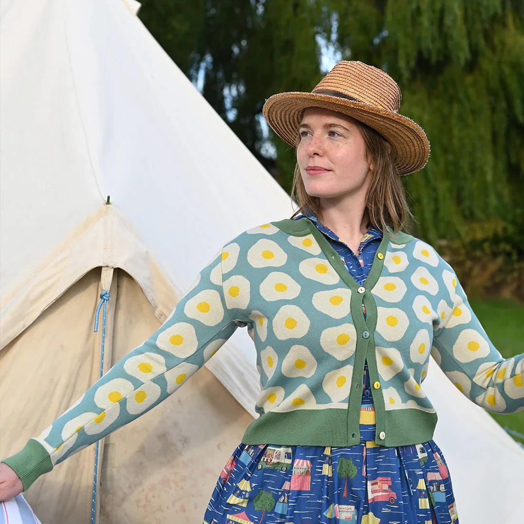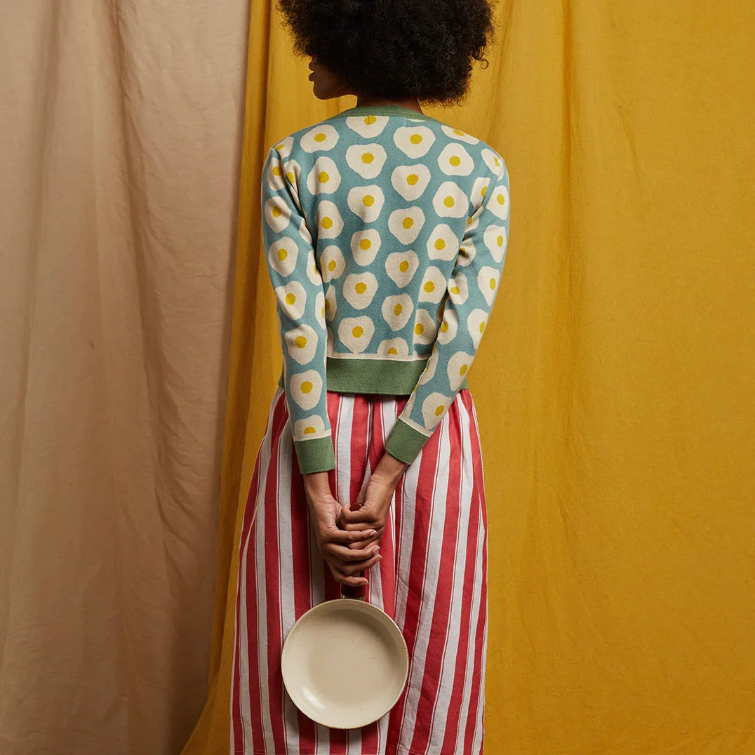 cardigan/fried egg/teal