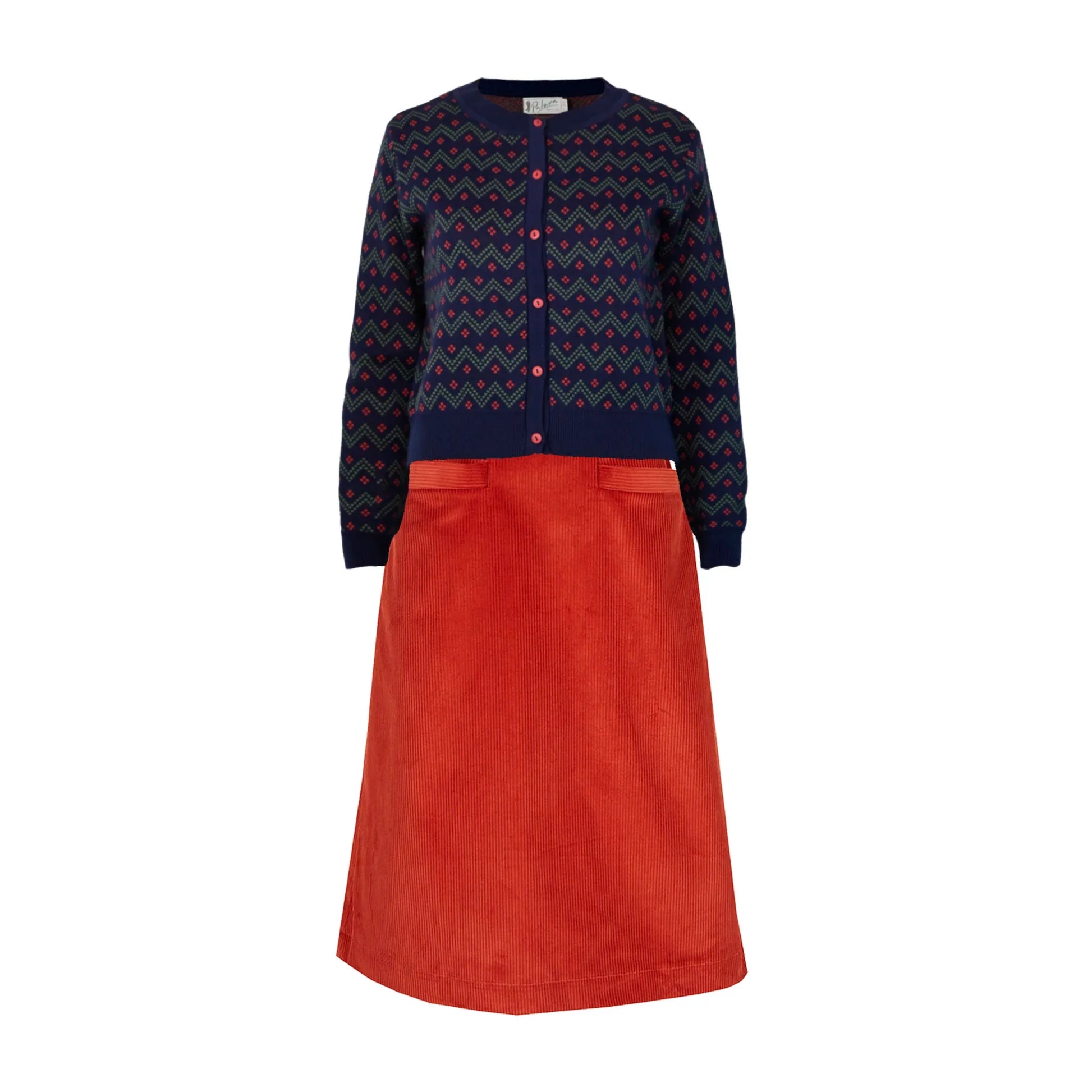 クロスハッチング。線を重ねて陰影をつける美術の技法がタイトルになったジャカードカーディガン。ネイビーベースにグリーンとレッドの並びがスタイリッシュ。合わせるボトム次第で可愛いコーディネートにも、しっとり大人の印象にも。