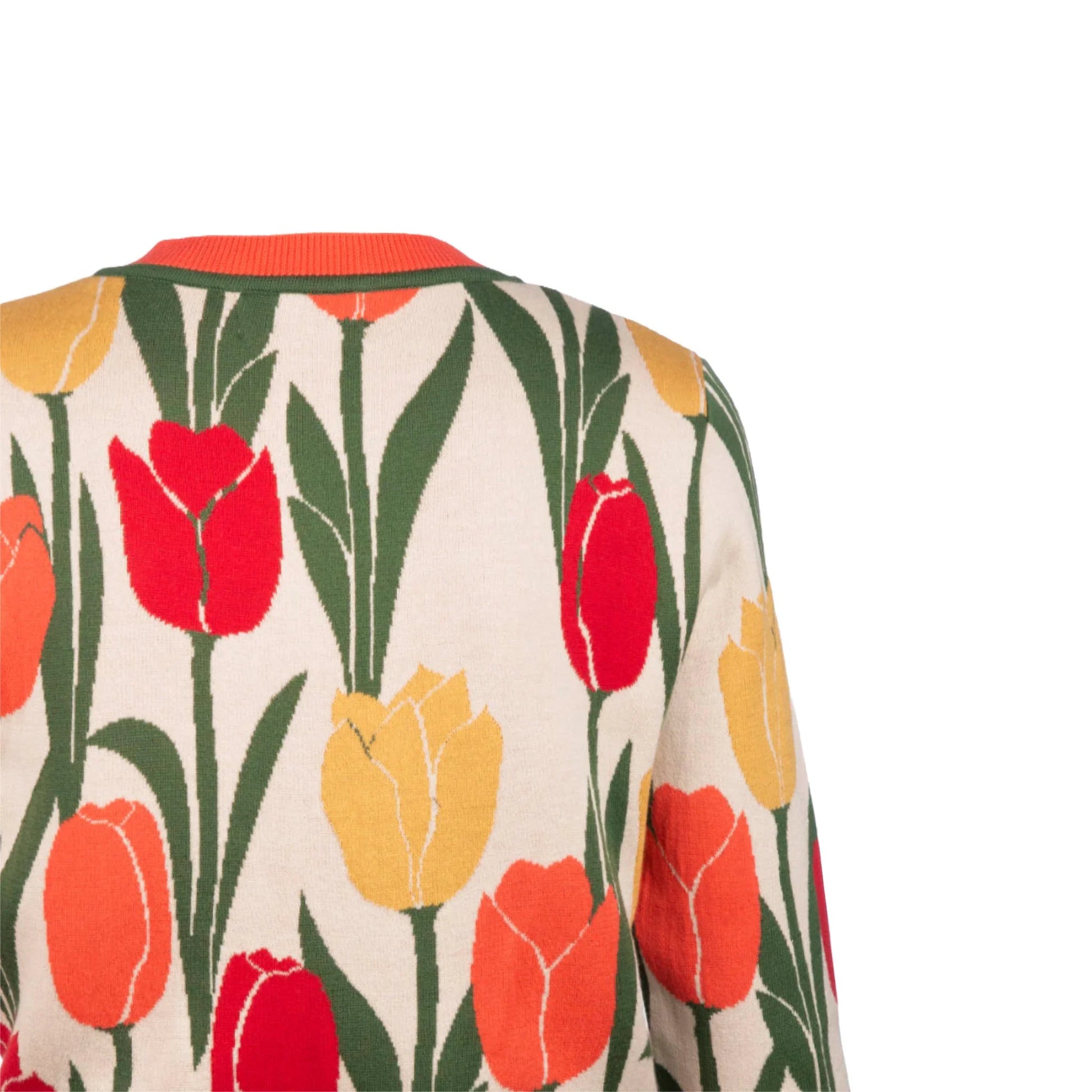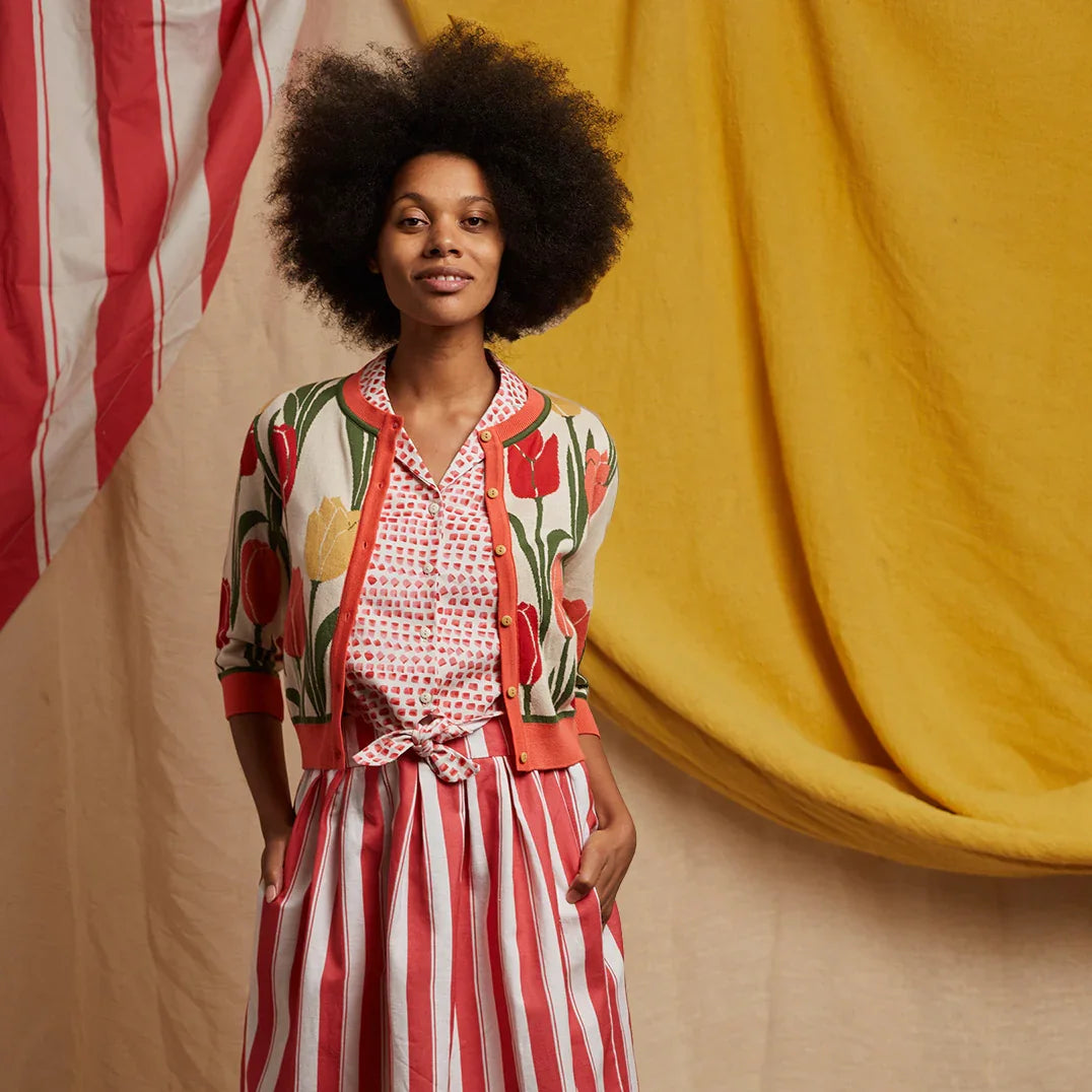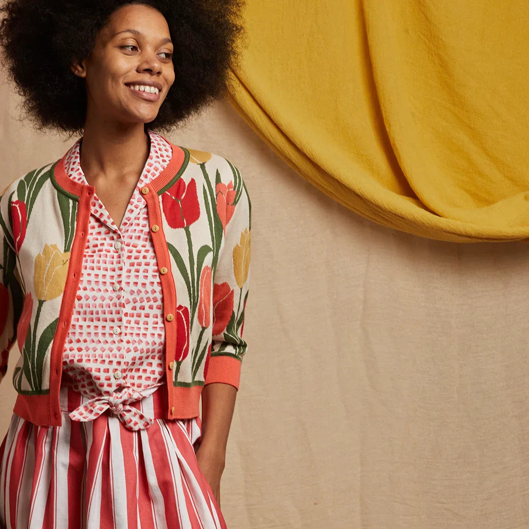 大人コーデにもカジュアルコーデにも。甘くなりすぎないチューリップの色とサイズ感が絶妙な一着。