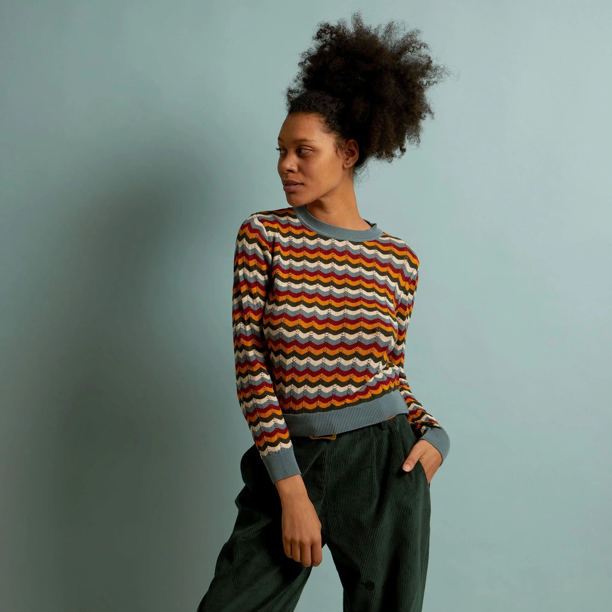 春夏半袖で大人気のEve(イヴ)の秋冬バージョンがこのクララ。テクスチャーのあるポワンテルの編み地に肩のパフスリーブ仕立ては可愛くなりすぎない絶妙なバランス。ミネラルブルーをベースに5色のスカラップ模様の軽やかなニットトップ。