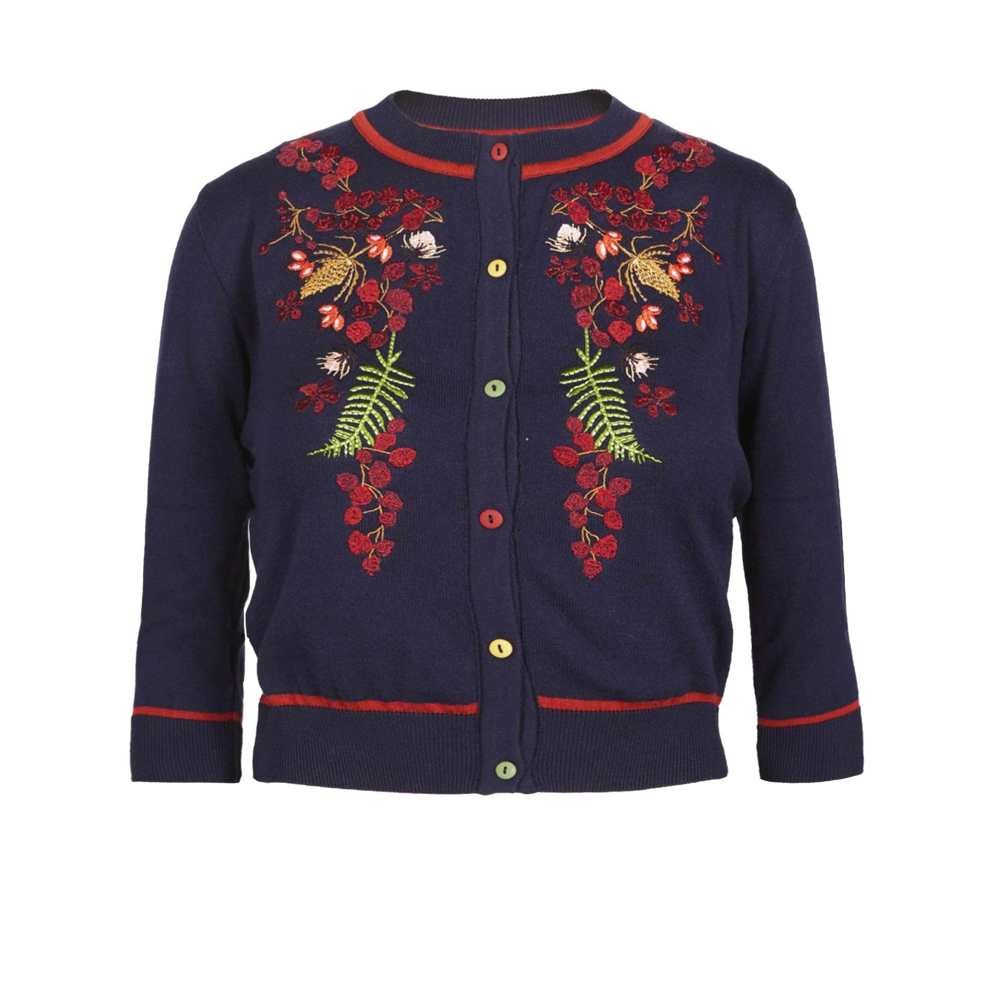 ネイビーベースに赤いベリーの実が刺繍で描かれた素敵なカーディガン!トリミングもベリーに合わせたレッド。袖は七分丈です。