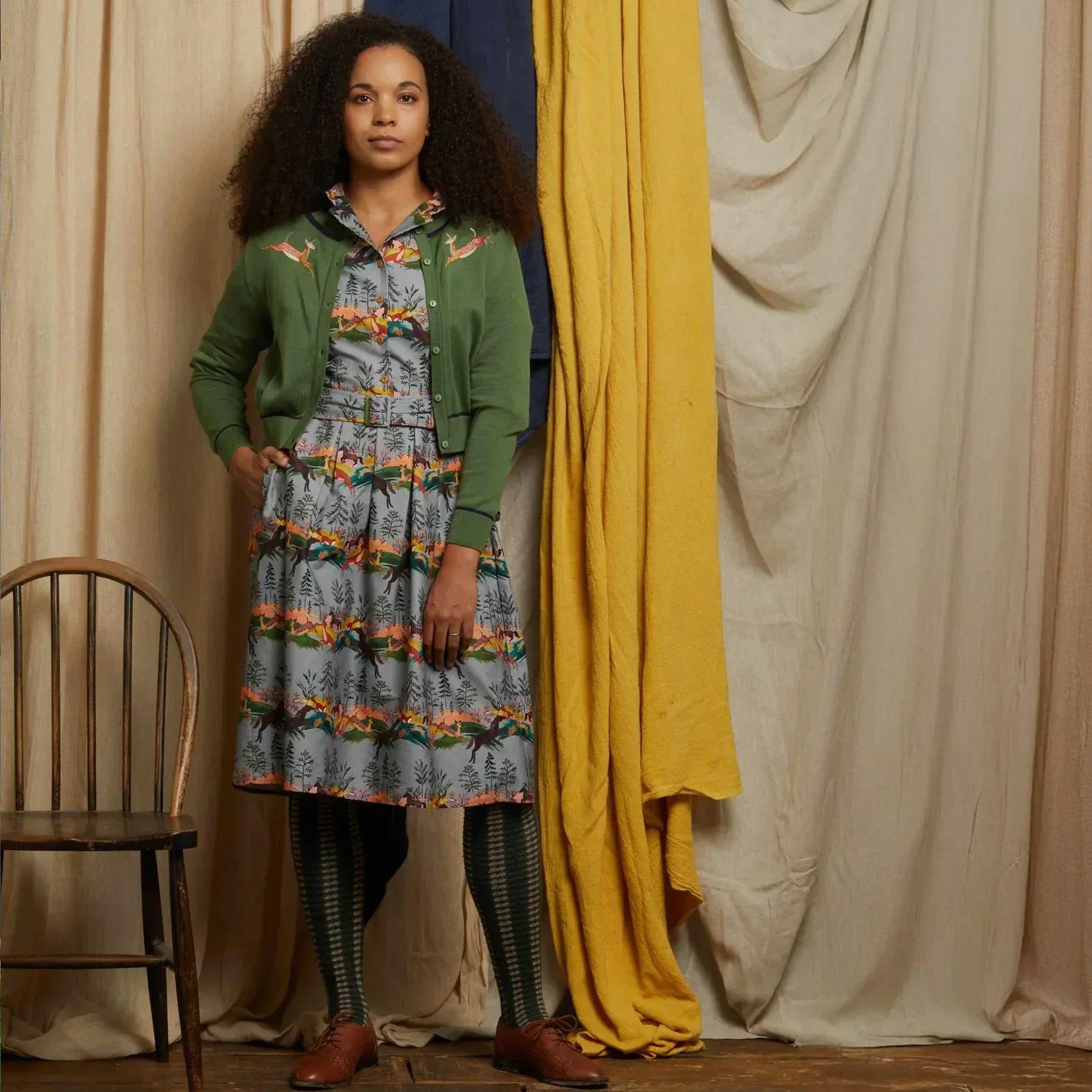 ひんやりと空気が落ち着いて季節が変わる、その直前の草原を思わせるグリーン。そこに仔鹿のジャンプだなんて・・・!是非カーディガンコレクションに仲間入りさせたい一着。