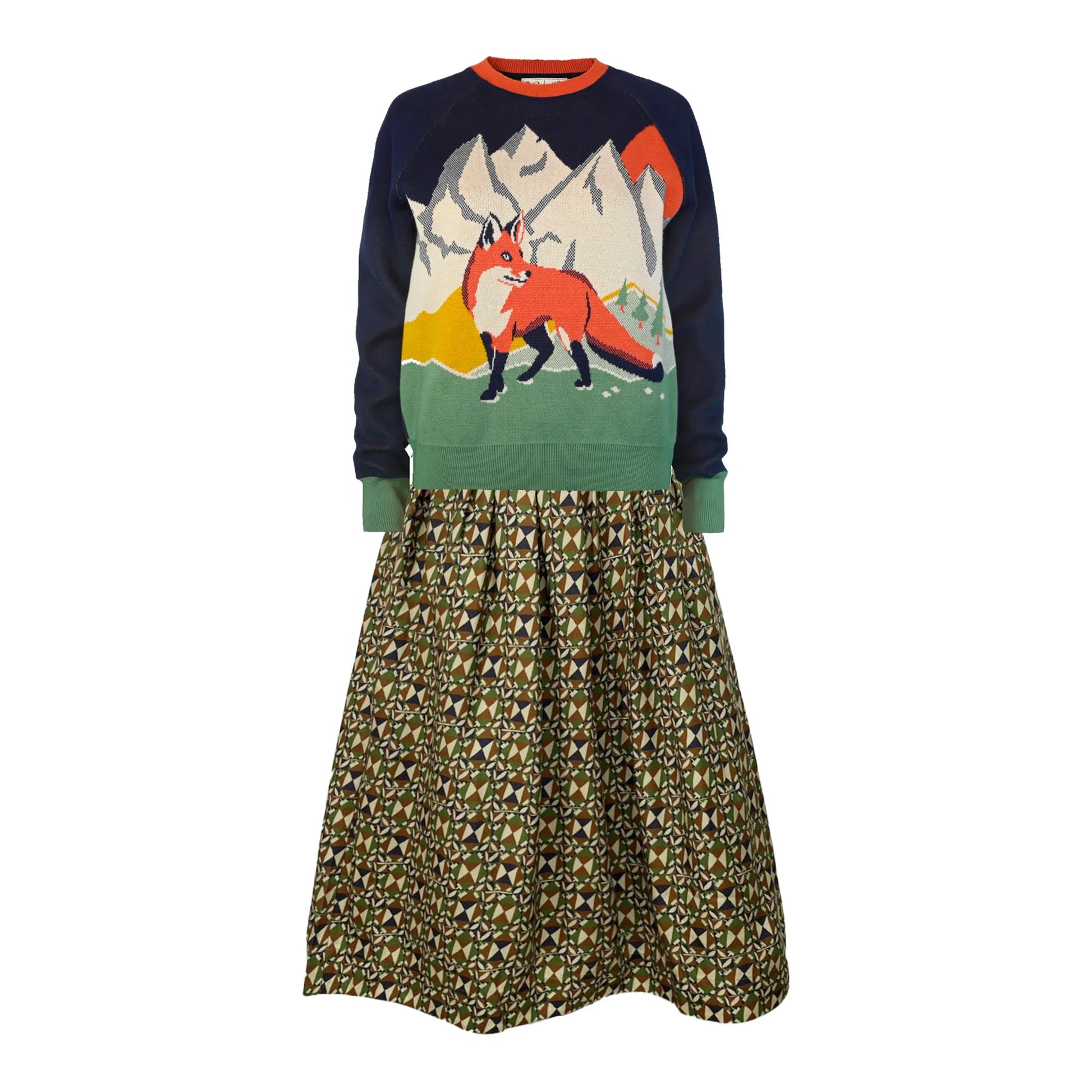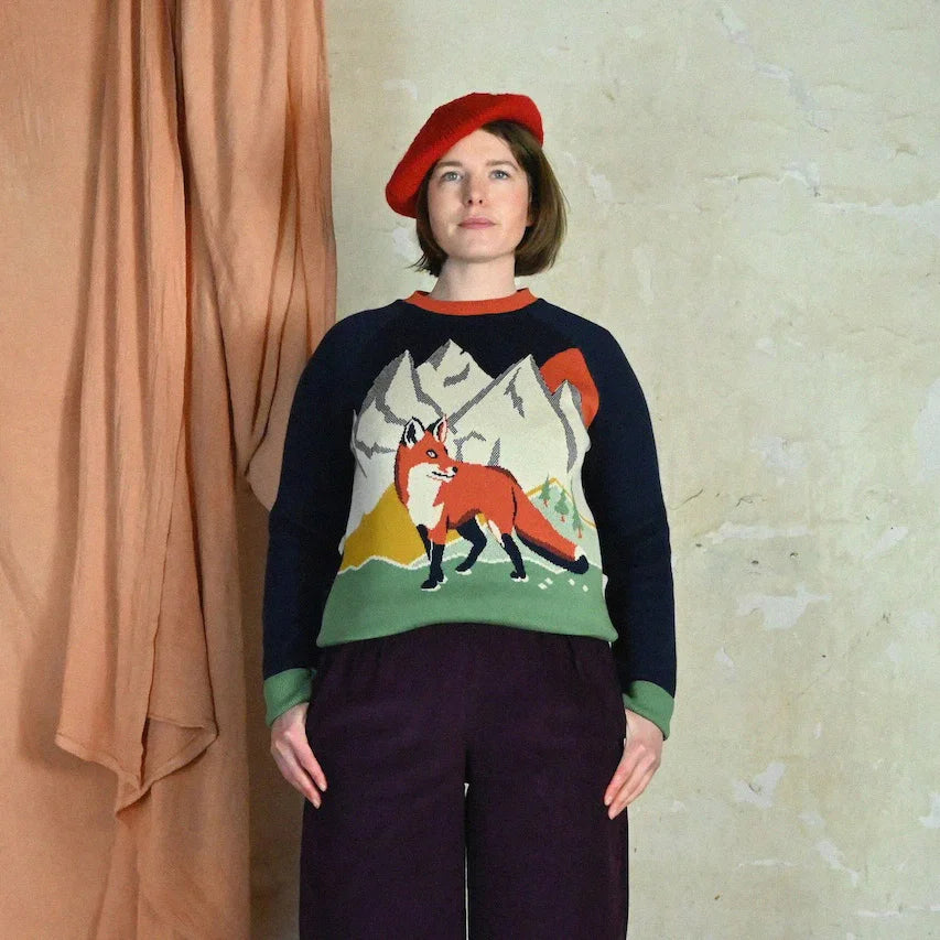 毎シーズン、パラバの新作ニットを楽しみにしているファンの中には、特にこの絵画のようなアーティスティックシリーズのコレクターも。登るには険し過ぎに見える山の頂き。その向こうは朝日?夕日?時間も大自然の風景も、気に留めずに優雅にゆっくり歩く狐の姿が主役の一着。