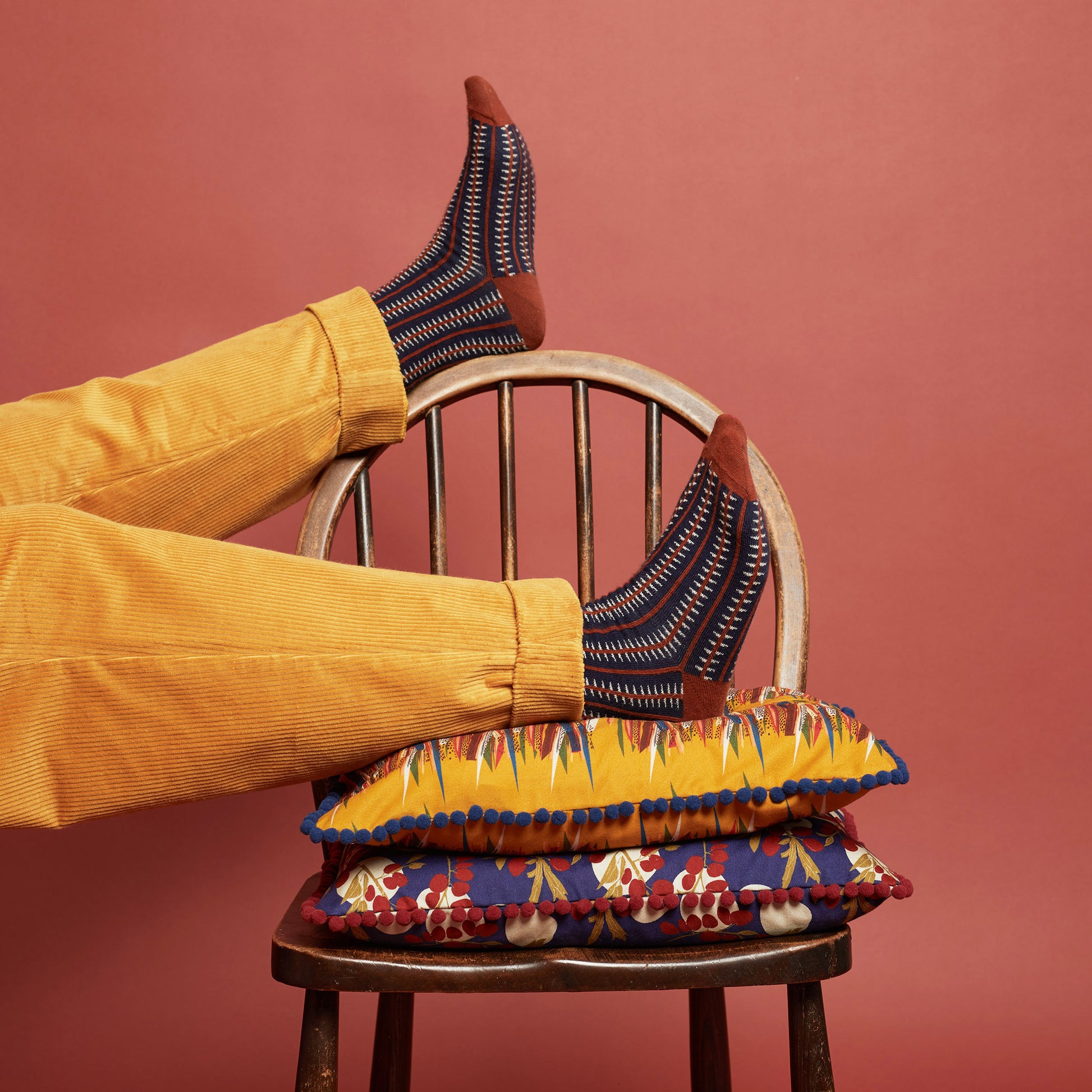 こちらはややオレンジがかったバーミリオンレッドのリブにネイビーと明るく淡いブルーグレーが効いたお洒落な1足。
