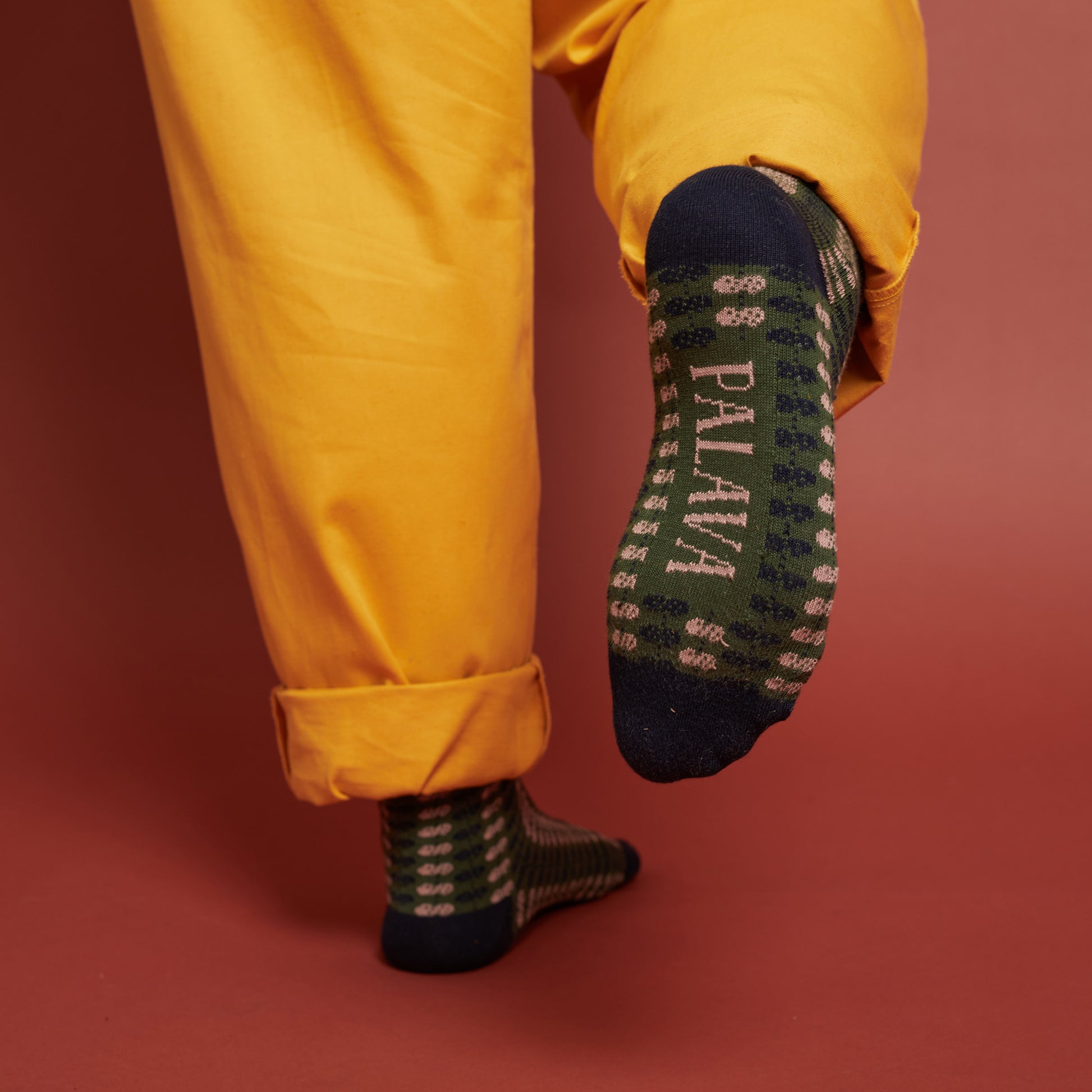 ”松ぼっくり”という可愛いネーミングのこちらのソックスは、抹茶グリーンのベースに優しいピンクとベージュのちっちゃな松ぼっくりがお行儀よく並んだ洒落た一足。リブ部分はネイビー。ソールに入ったPALAVAロゴも見せびらかしたくなっちゃいます。
