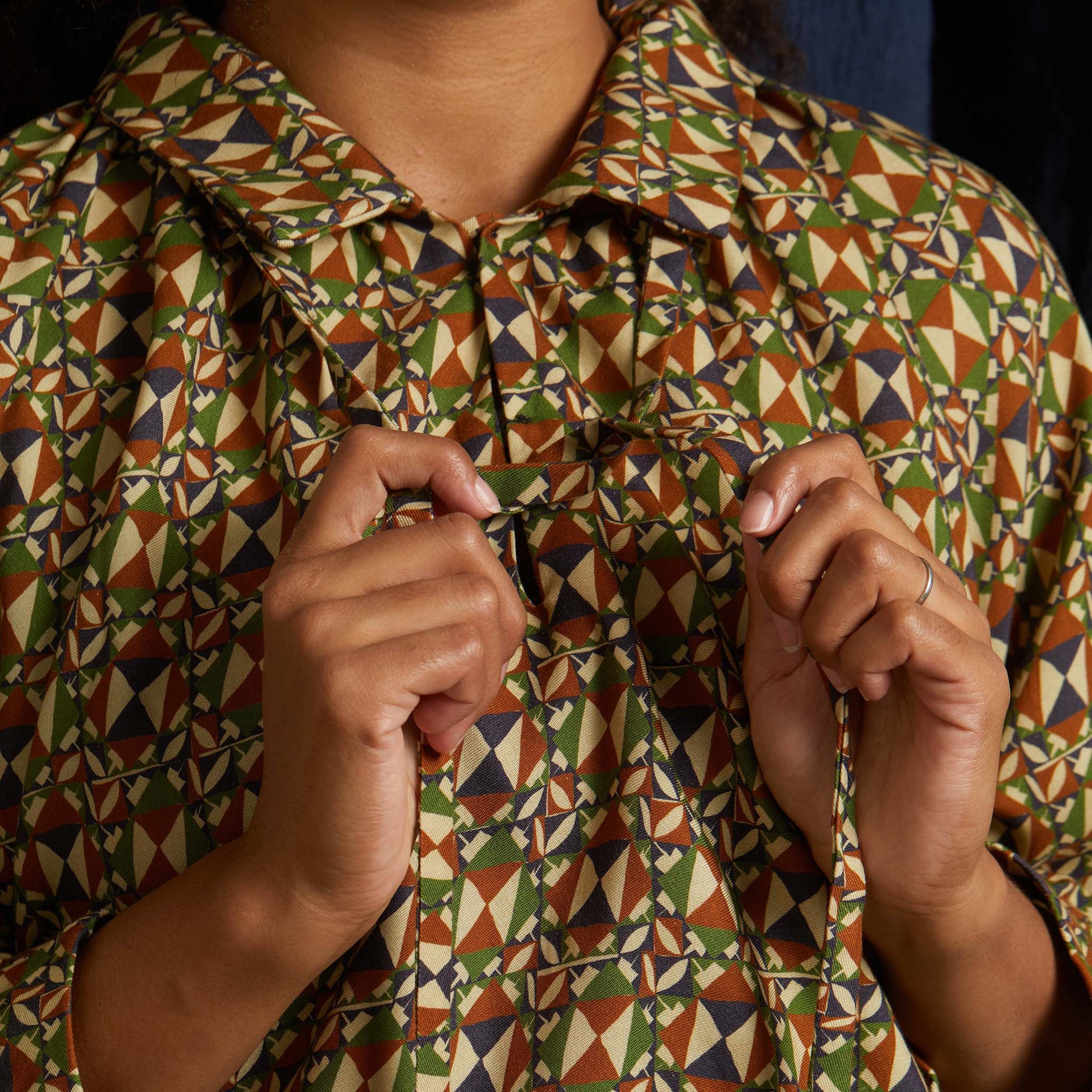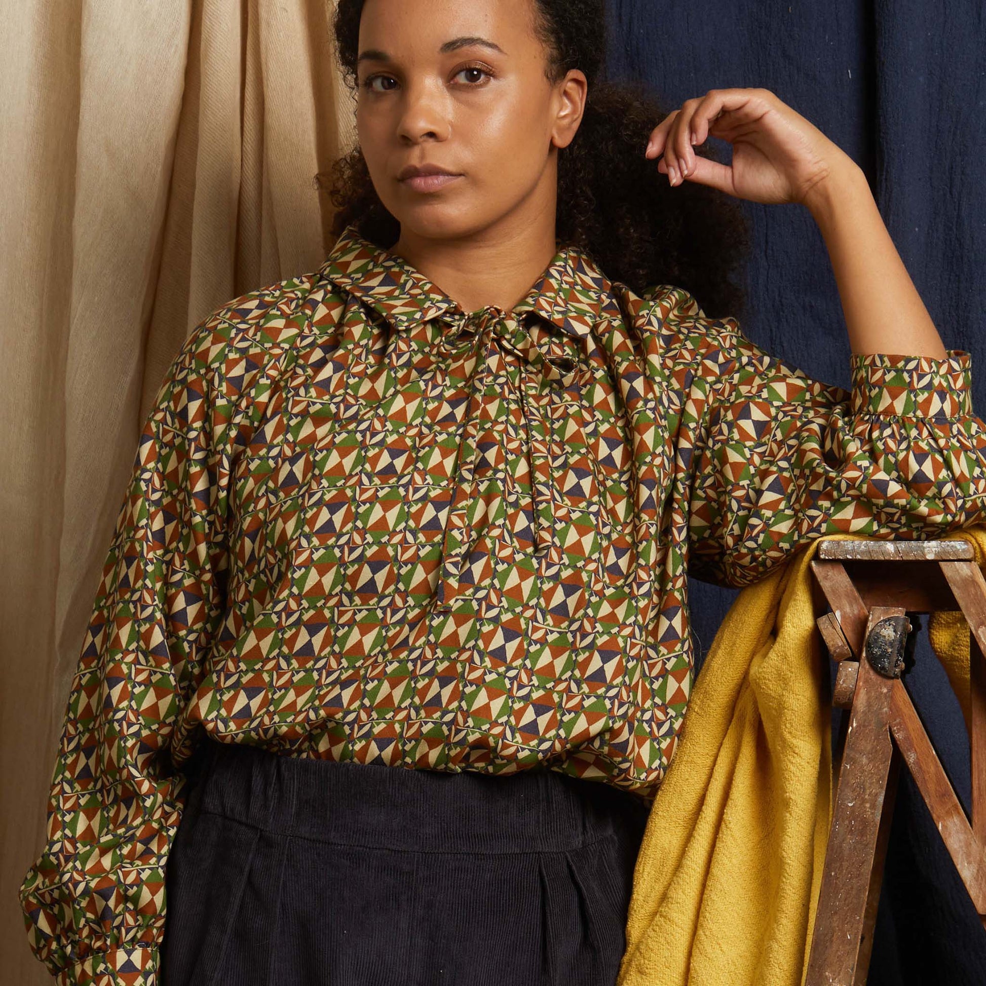ジョアンは今シーズンデビューのブラウス。通年活躍しそうな着回しの良いシルエットで襟元は内側に二つのボタン。リボンは外せます。