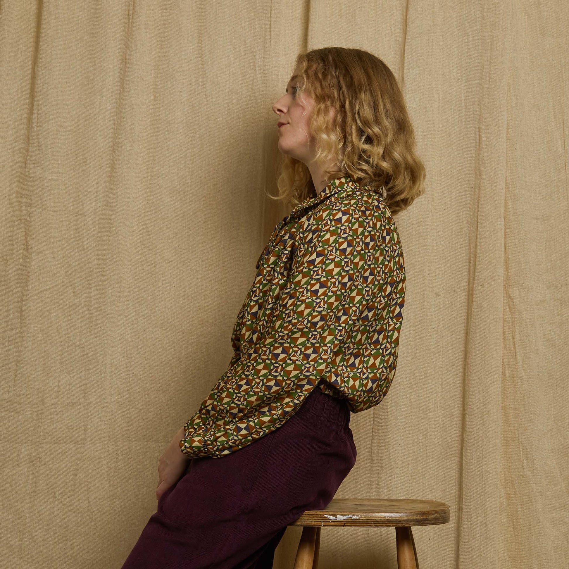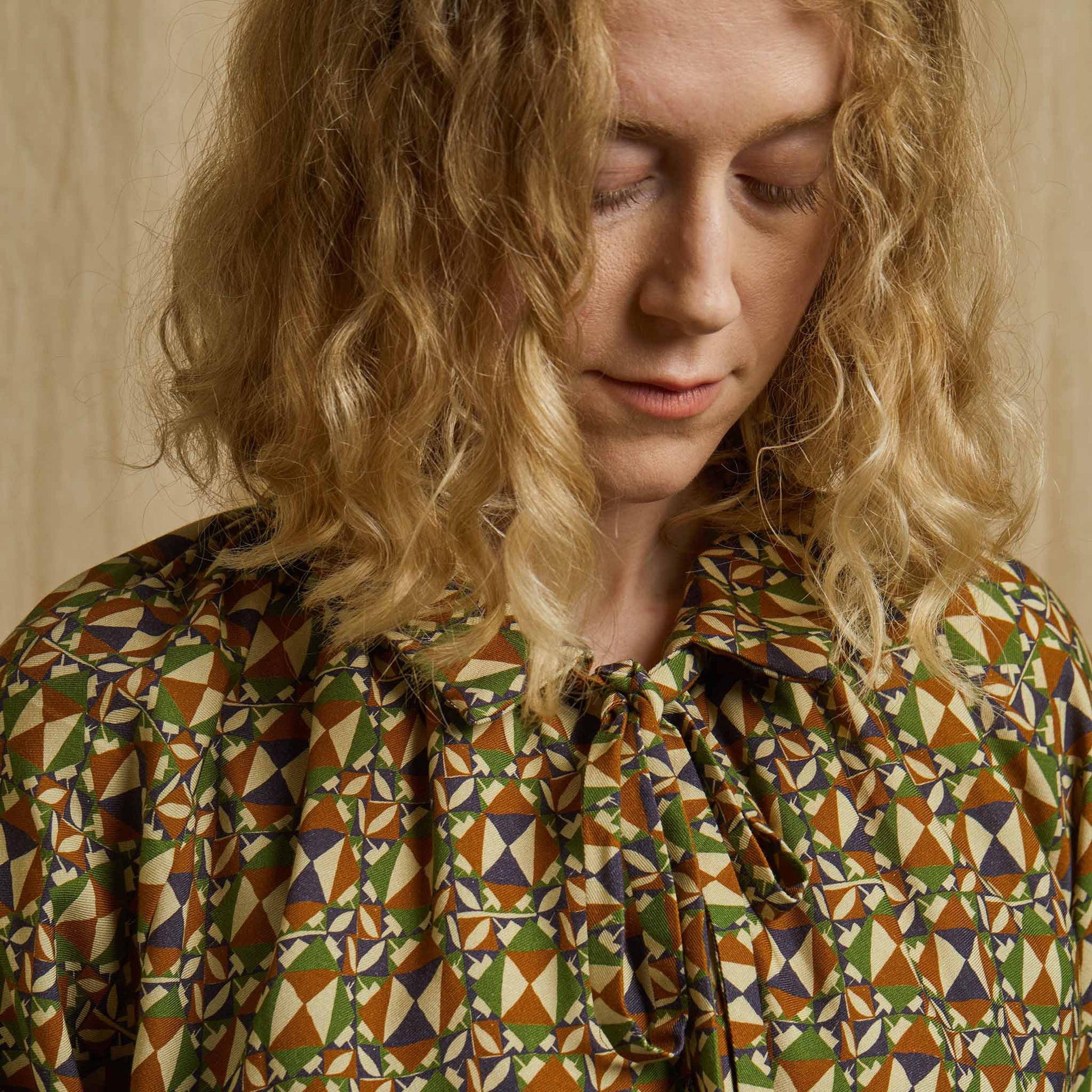 こちらは”チェッカー”というタイトル。チェック柄を、パラバテイストの幾何学模様に再解釈したようなこのプリントは、高い空の上から見渡したファームヤードの屋根や農場からイメージされたもの。