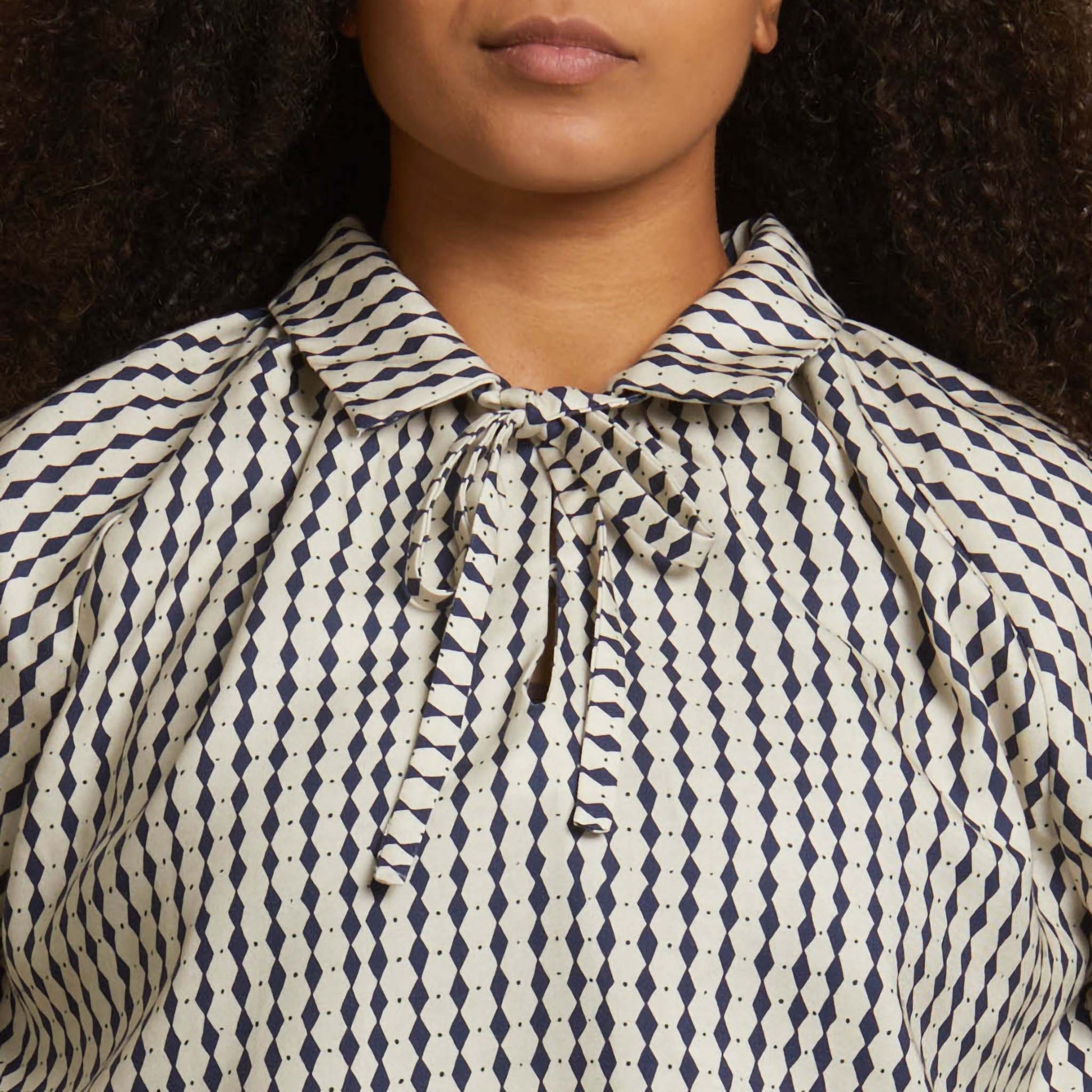 ジョアンは今シーズンデビューのブラウス。通年活躍しそうな着回しの良いシルエットで襟元は内側に二つのボタン。リボンは外せます。