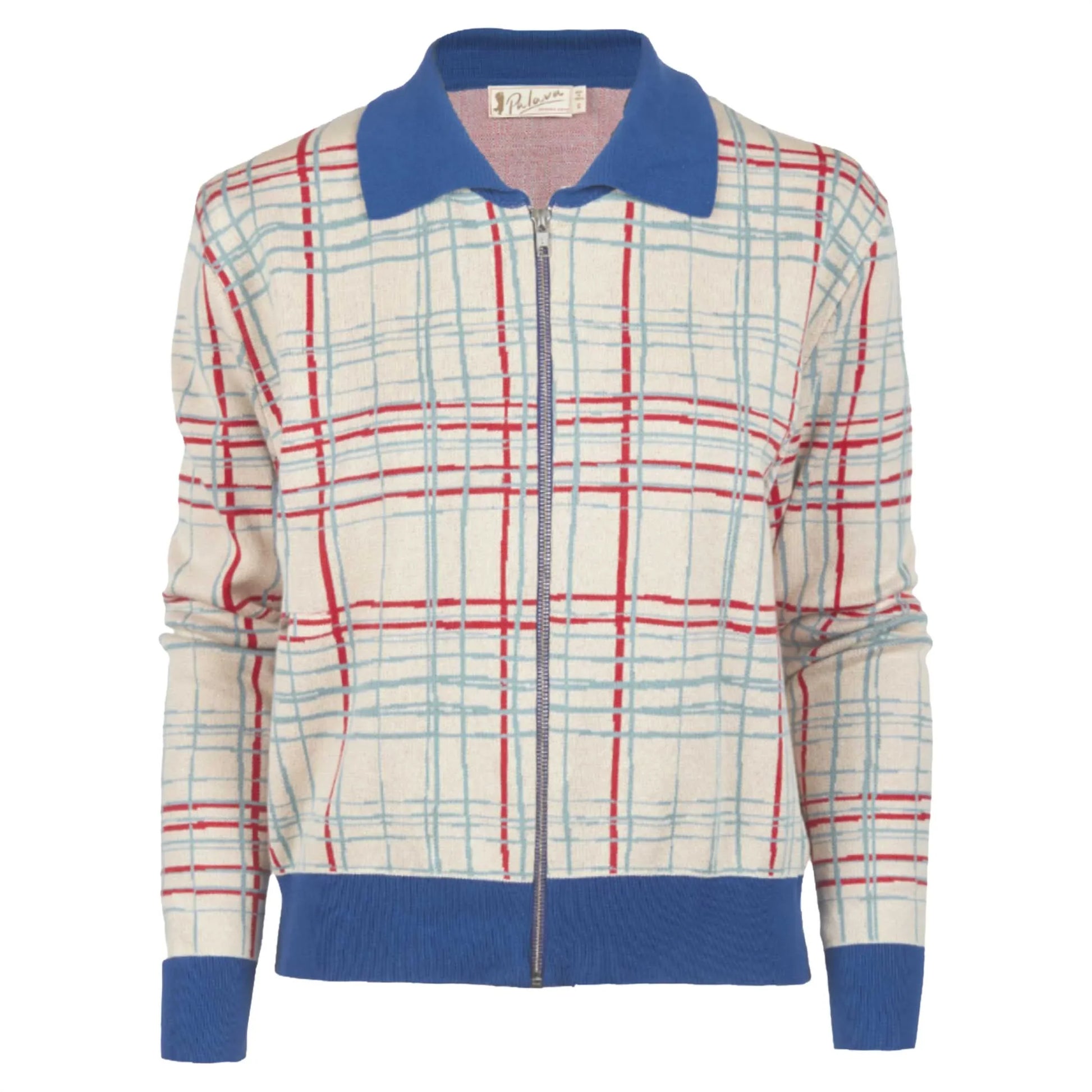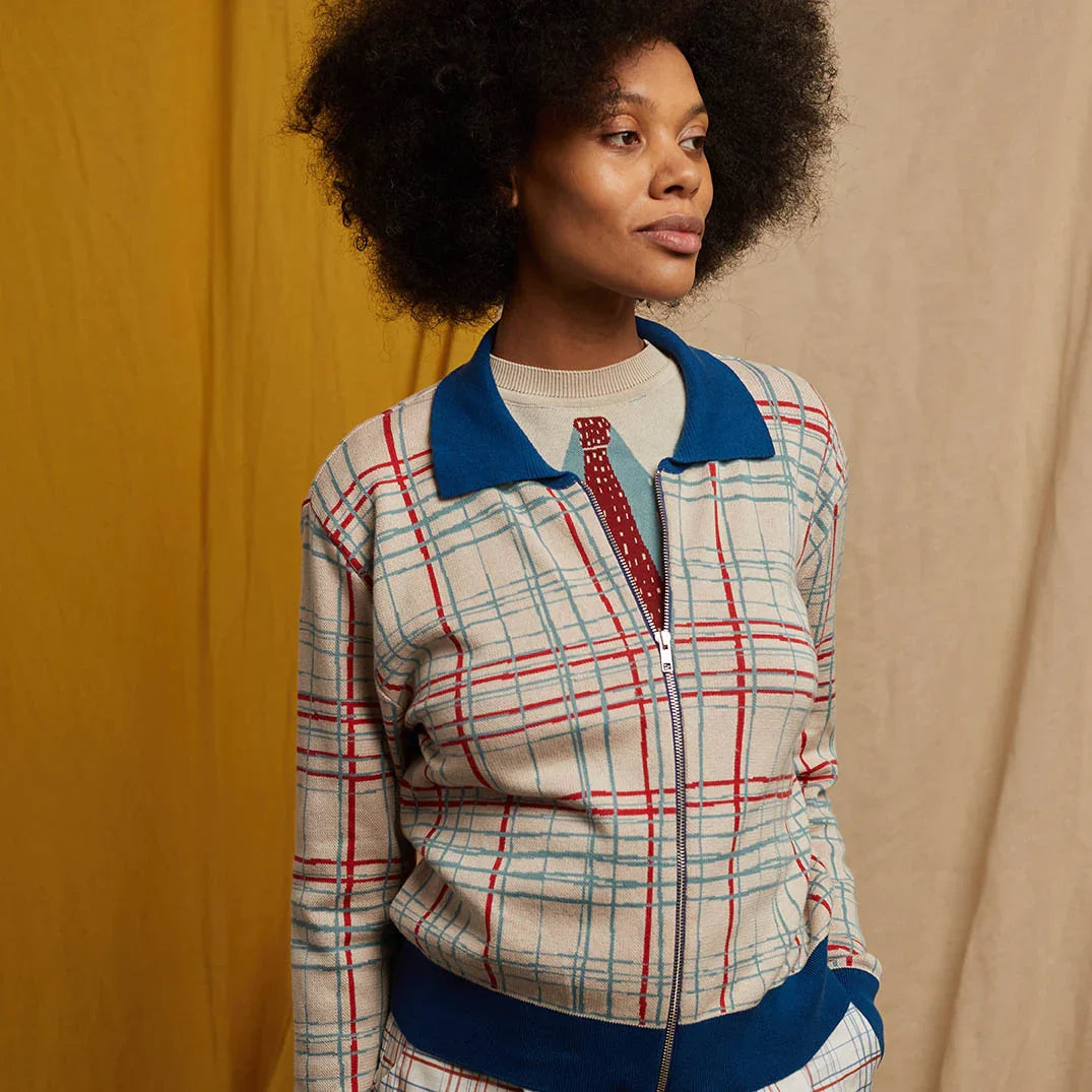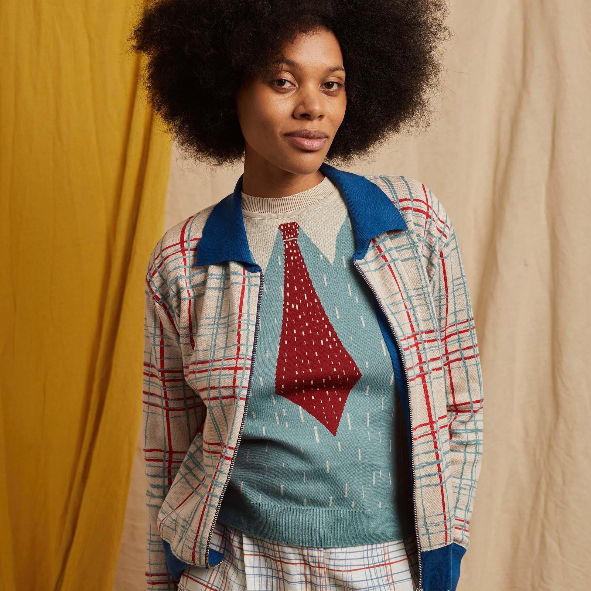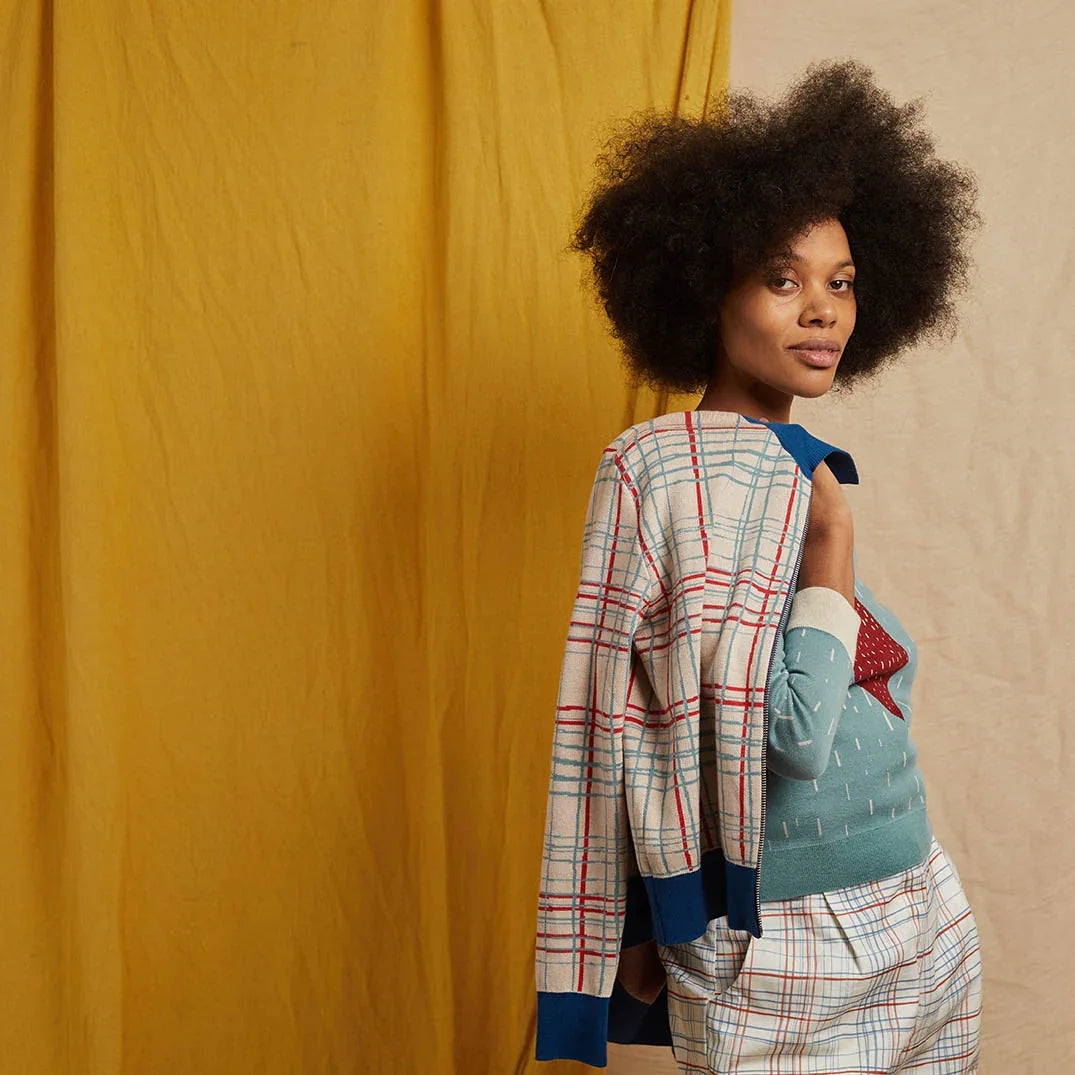昨シーズンデビューのケイトはジップフロントのアウターニット。ちょっと”ワル”な雰囲気も漂うこちらのフォークチェックは、キリッとしたブルーがフォークロアなチェックを引き締めています。