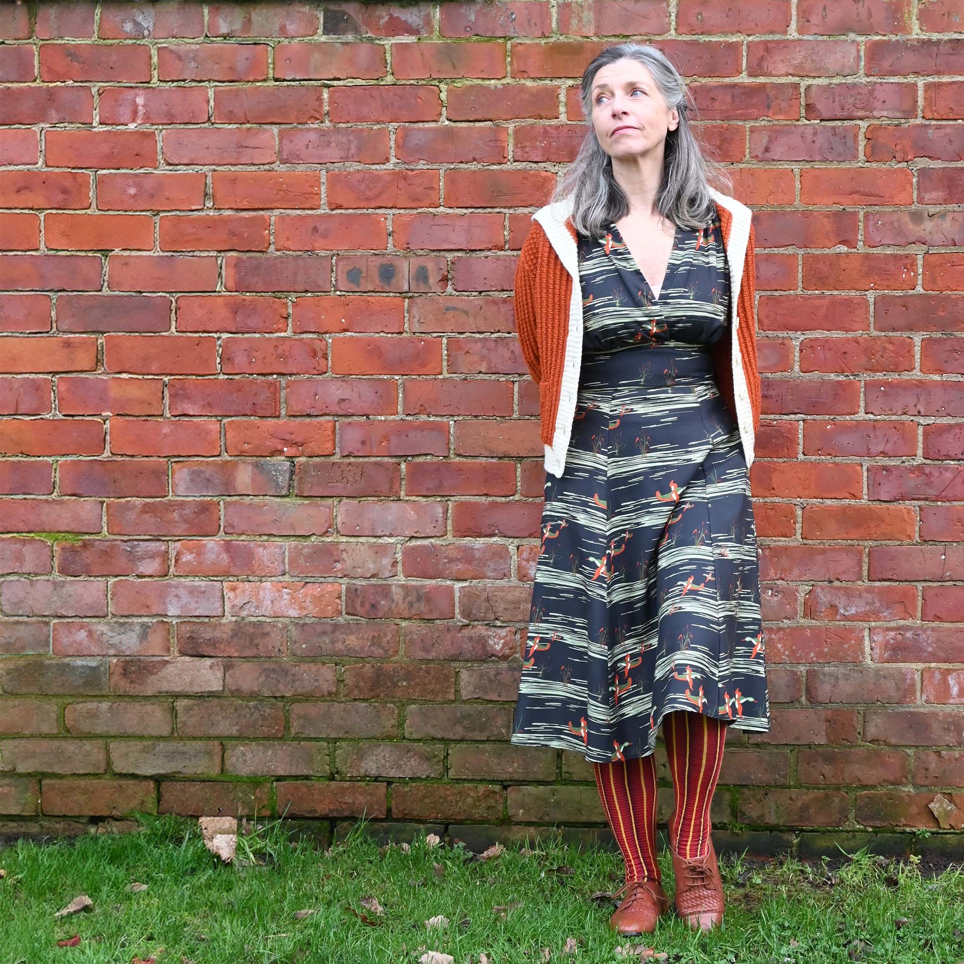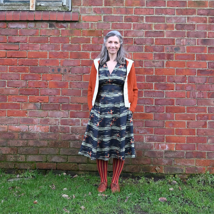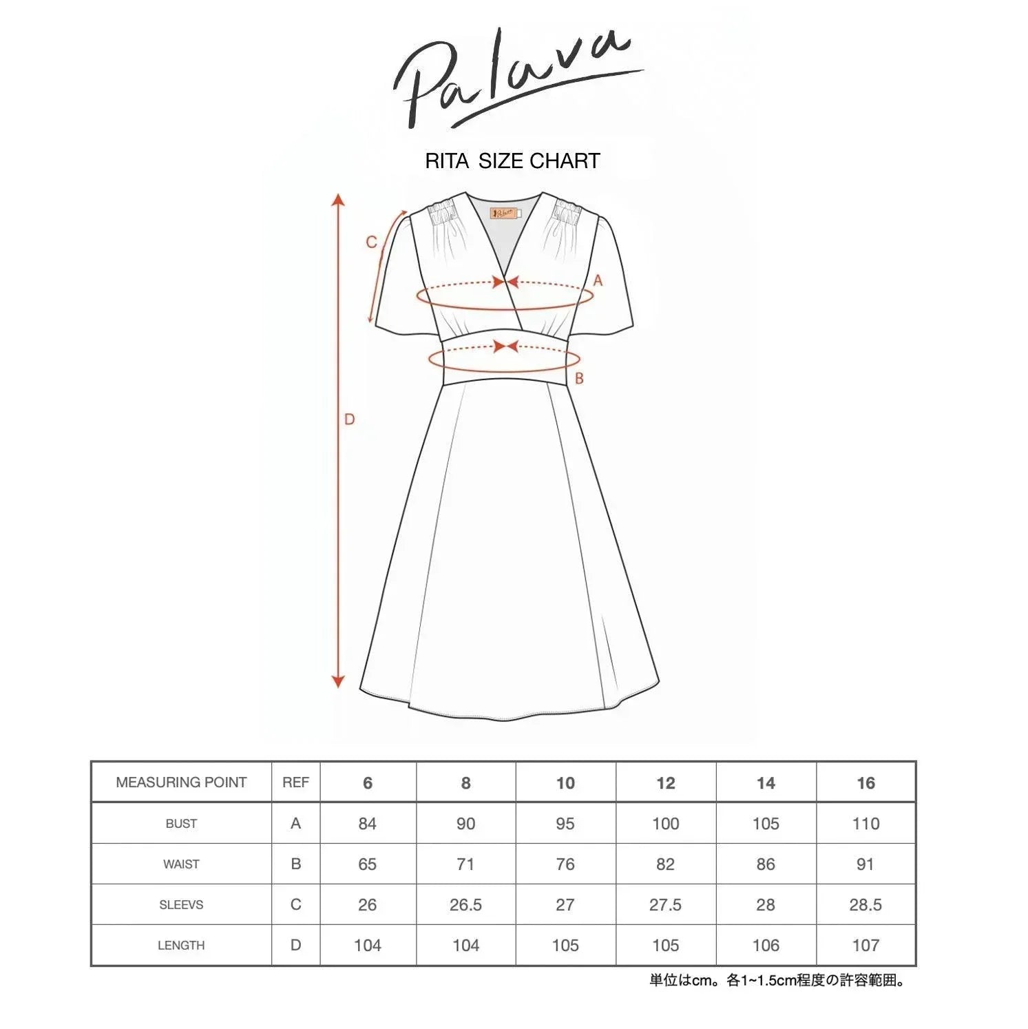 パラバでは珍しいブラックのバックグラウンドに、水面から飛び立つ鮮やかなカモ。実は1940年代のヴィンテージデザインにインスパイアされたもの。リタドレスのシルエットともバランスの良いイラストレーションで、エレガントなドレスに仕上がっています。