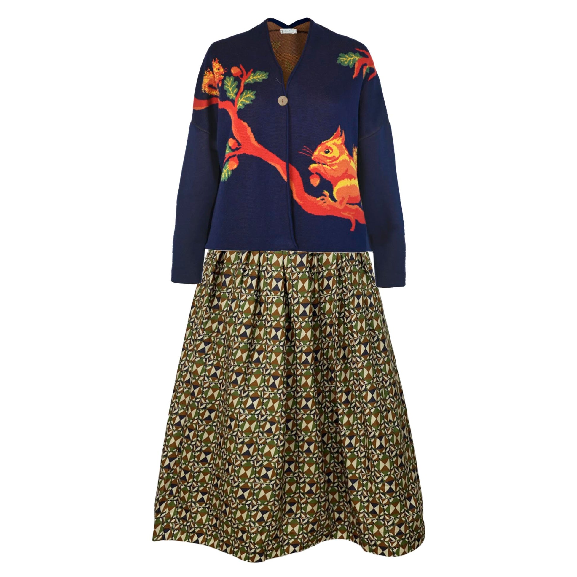 こちらはネイビーベースにリスの親子、バックにまでドングリ付きなんてずるい!? と言いたくなるくらいのラブリーな一着。ジャカード編みのオーガニックコットンニットです。