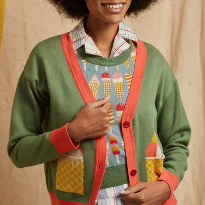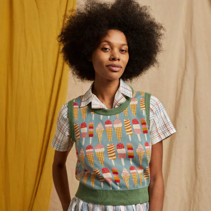 数シーズン前のデビューから人気上昇中のコットンニットベスト、シャーリー。今年はアイスクリーム!!是非片手にストロベリーソルベなど持ってセルフィーして!